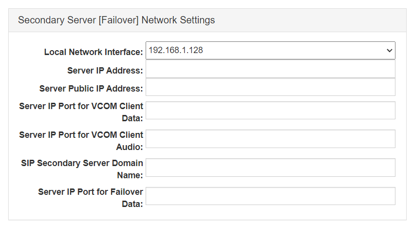 On the primary server log into the System Administration and from the System Configuration tab select System Settings. In the Secondary Server [Failover] Network Settings click the Local Network Interface dropdown and select the IP address to use for communication between the Primary Server and the Secondary Server. In the Server IP Address field enter the IP address of the Secondary Server. In the Server IP Port for VLink Client Data and Server IP Port for VLink Client Audio fields type 1000. In the Server IP Port for Failover Data field type 1001.
